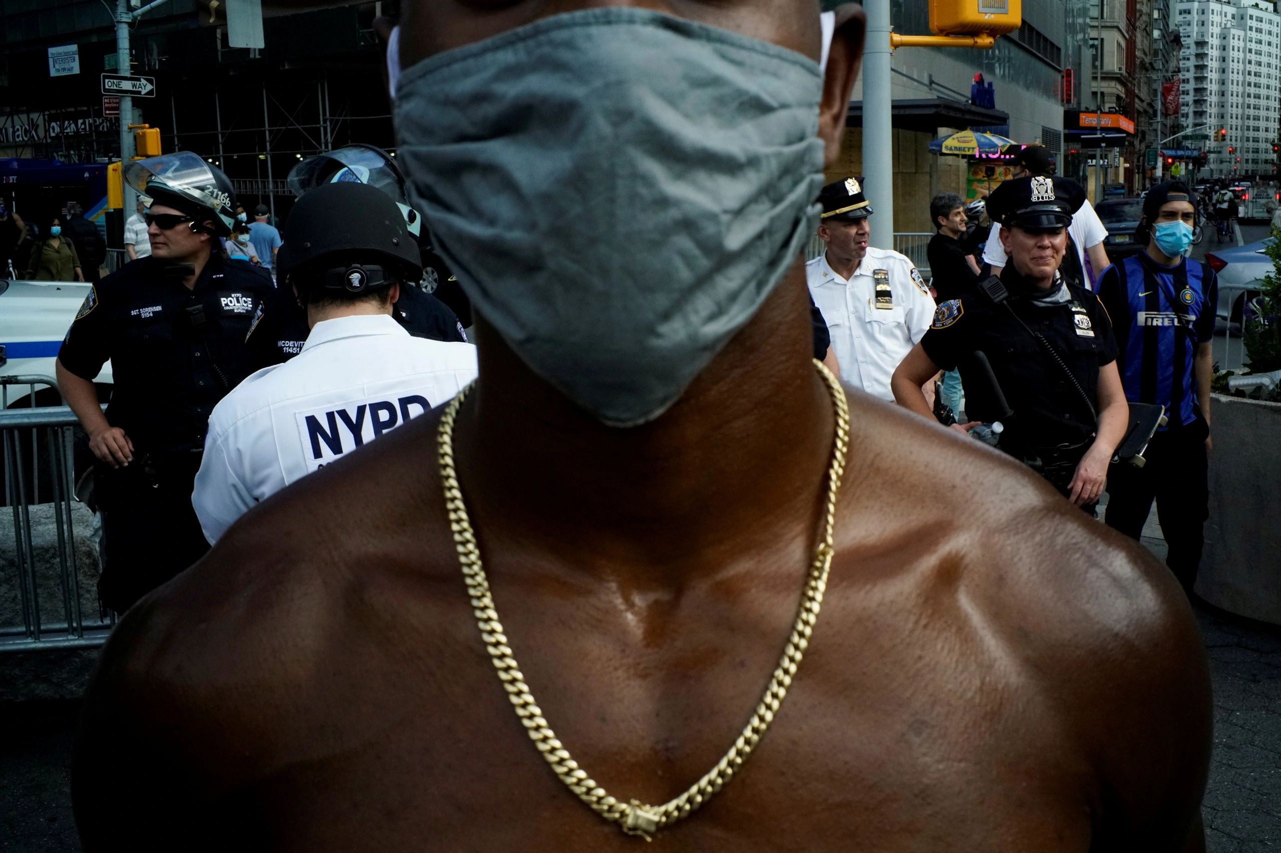 A demonstrator wearing a face mask stands in front of police officers during a protest against the death in Minneapolis police custody of George Floyd, in New York City, New York, U.S., June 4, 2020. REUTERS/Eduardo Munoz TPX IMAGES OF THE DAY