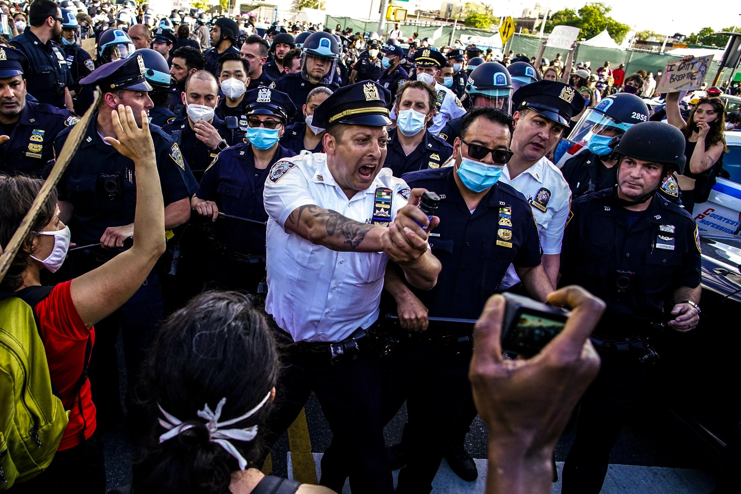 A NYPD police officer sprays protesters as they clash during a march against the death in Minneapolis police custody of George Floyd, in the Brooklyn borough of New York City, U.S., May 30, 2020. REUTERS/Eduardo Munoz TPX IMAGES OF THE DAY
