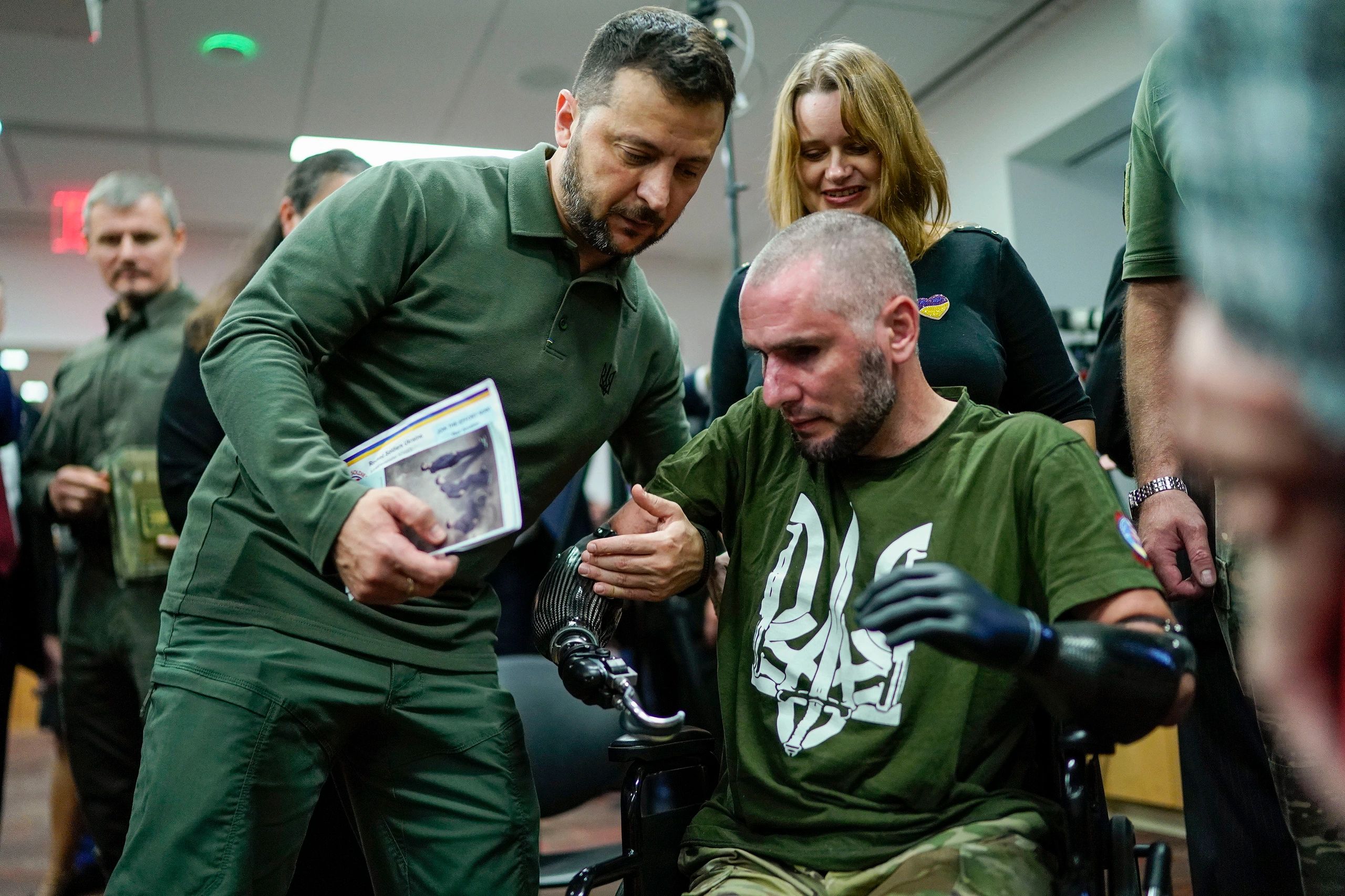 Ukrainian President Volodymyr Zelenskiy helps a wounded soldier to stand up as he gives a award to a wounded soldier during his visit at the Staten Island University Hospital in New York where Ukrainian soldiers are being treated for war injuries, on September 18, 2023. REUTERS/Eduardo Munoz